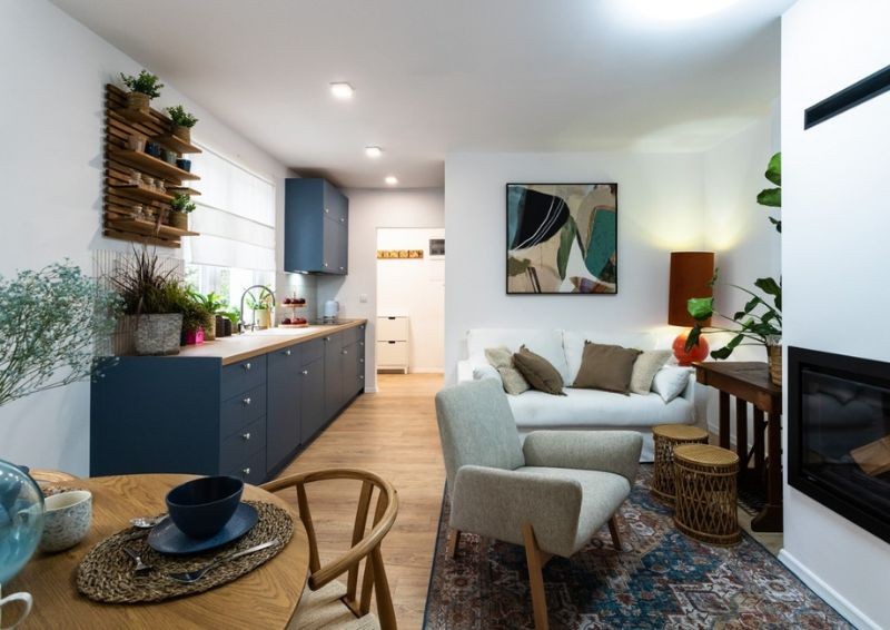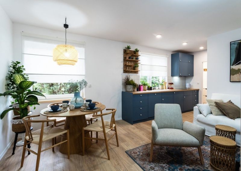 Architekta Martyna Kupczyk nie miała łatwego zadania. Jej celem było wygospodarowanie wnętrz w taki sposób, by każdy mógł zyskać własny kąt i odrobinę prywatności. Tym samym, niewątpliwie najważniejszym miejscem stanie się nowa, luksusowa kuchnia połączona z jadalnią i salonem. To tutaj rodzina będzie cieszyć się wspólnie spędzanym czasem. Dzięki wykorzystaniu białej farby na ścianach, pomieszczenie zyskało na przestronności. Za to przytulności nadają skomponowane ze sobą meble – Martyna wybrała jasnobrązowy okrągły stół oraz pasujące do niego krzesła, a w części salonowej zaaranżowała białą sofę i szary fotel. Całość dopełnia dekoracyjny, wyróżniający się dywan. Aby złamać monotonię kolorów, w części kuchennej meble dobrano w odcieniu intensywnego granatu. Natomiast uroku dodają liczne akcenty roślinne.