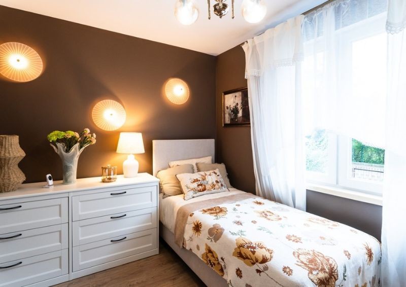 Trzeci pokój całkowicie różni się kolorystyką od poprzednich aranżacji. Na ścianach pojawiła się farba w odcieniu czekolady i dobrano niej beżowe dodatki, łącznie z pościelą. O poczucie przytulności dbają liczne obrazy oraz lampki. Szczególnie ciekawy okazał się być kącik relaksu, w którym postawiono drewniany fotel i mały stolik na kawę czy herbatę.