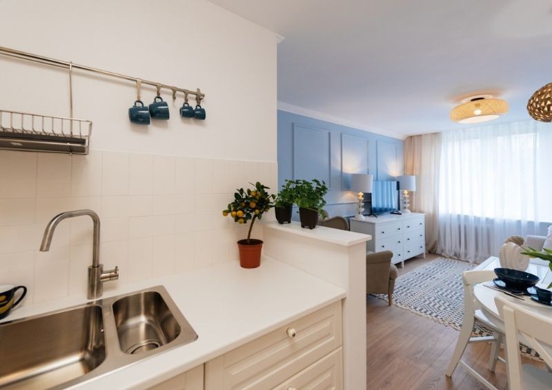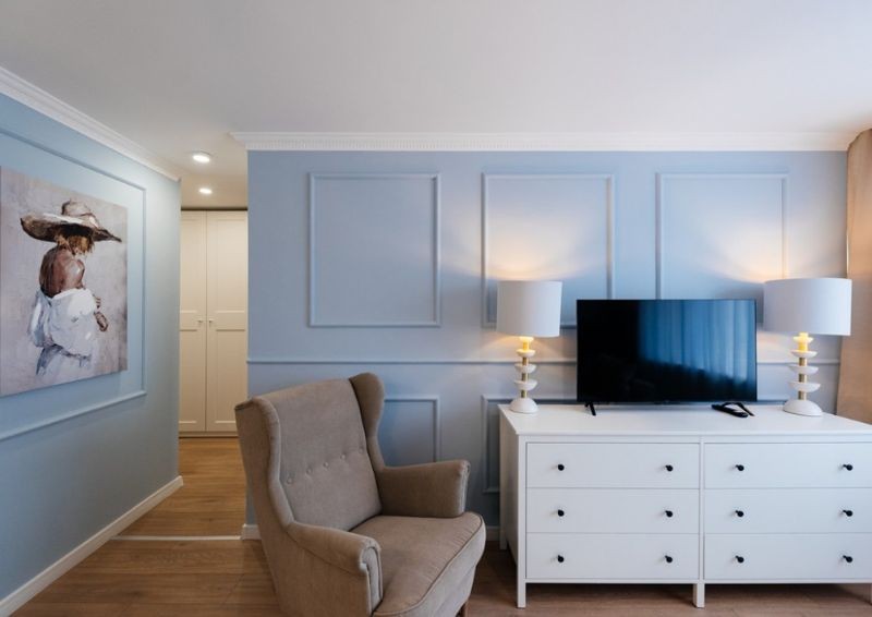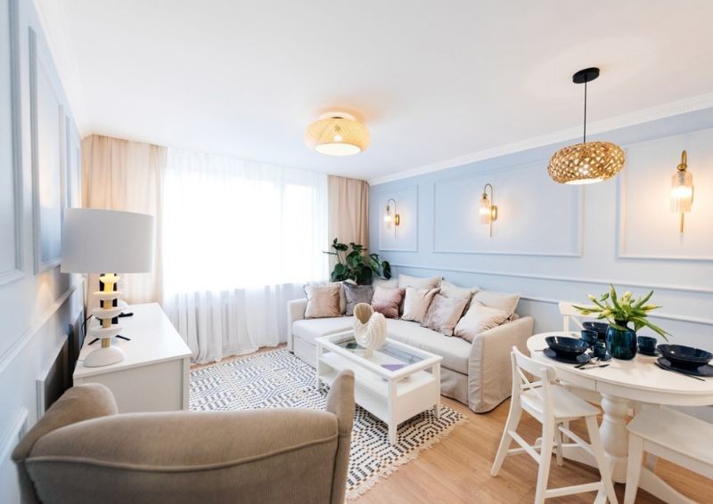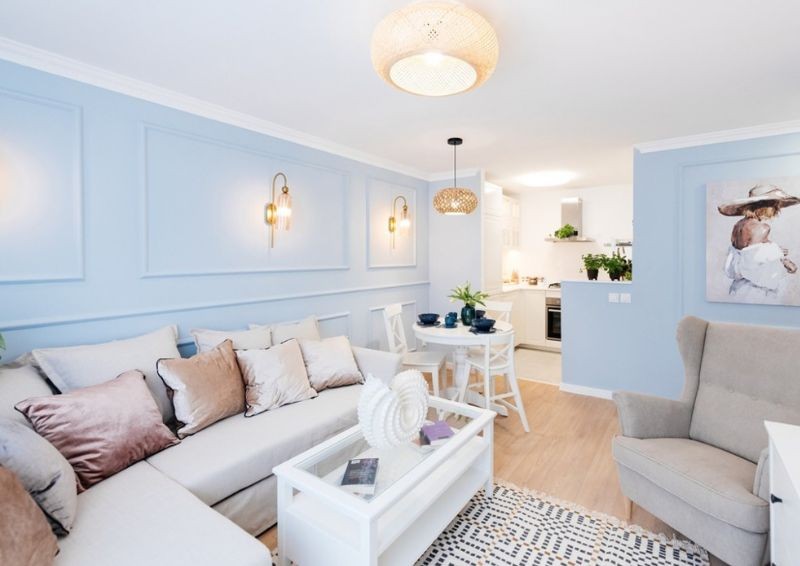 Z największego pomieszczenia w mieszkaniu zniknęło łóżeczko dziecięce. Martyna zaaranżowała nową przestrzeń w taki sposób, by służyło jako sypialnia dla pani Pauliny oraz salon z jadalnią. Dodatkowo bezpośrednio przybliżono kuchnię do salonu, ponieważ pozbyto się zawadzającego okna. Po miszmaszu nie było już śladu. Ściany pomalowano w odcieniu błękitu oraz dodano beżowo-białe meble. Kobiety zyskały nowy, przytulny azyl, w którym nie brakuje funkcjonalności oraz dekoracyjności.