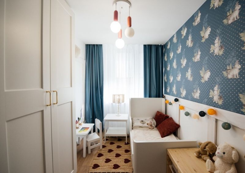 Mały pokój, w którym znajdował się telewizor i pojedyncze łóżko dla osoby dorosłej stał się pełnoprawnym pokojem dla małej dziewczynki. Na ścianach położono tapetę z motywem królików oraz dodano dekoracyjne miśki. Nie zapomniano także o kąciku zabaw ze stolikiem, a całość dopełnia wygodnne łóżko oraz przestronna szafa.