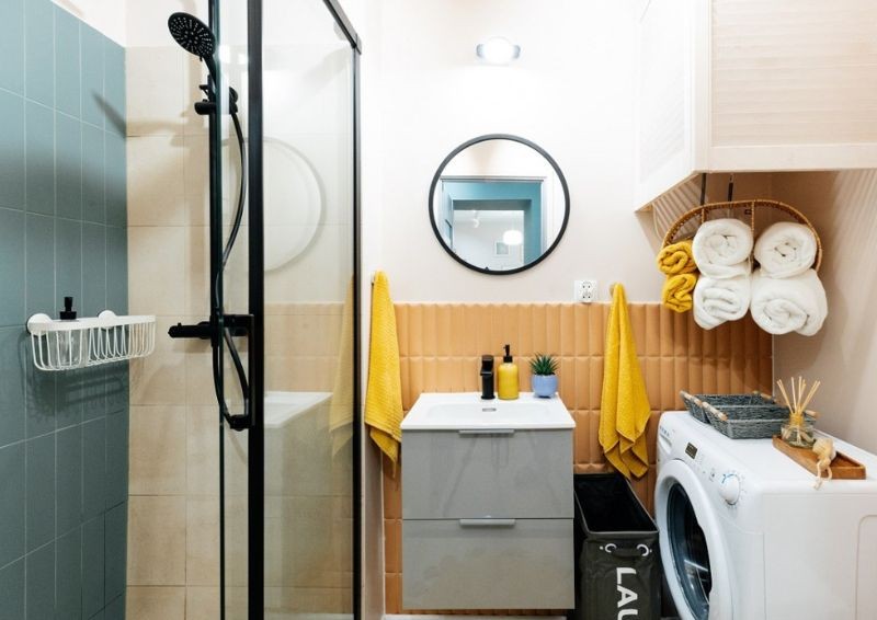 Chłopcy wraz z mamą najbardziej ucieszyli się z małej, ale funkcjonalnej łazienki, w której umieszczono prysznic, umywalkę, toaletę i pralkę. Od teraz skończą się prysznice na zewnątrz w spartańskich warunkach. Pomieszczenie zyskało na dekoracyjności dzięki pionowo położonym cienkim płytkom, które spędzały sen z powiek ekipie remontowej.