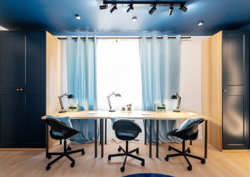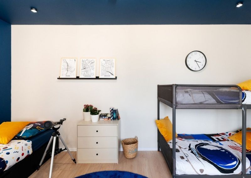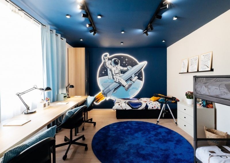 Prawdziwym królestwem okazała się być sypialnia chłopców. Nie zabrakło w niej elementów nawiązujących do kosmosu, prawie jak z marzycielskiego projektu trojaczków. Wybrano do tego granatową farbę, którą położono na suficie i na jednej ze ścian, pozostałe pomalowano na biało. Tym samym przestrzeń nie przytłaczała ciemnością. W środku znalazły się dwa łóżka, jedno pojedyncze i drugie piętrowe. Dzięki temu zyskano na większej przestrzeni na trzy biurka oraz wyśniony dywan. By nawiązać do kosmosu, na suficie zamontowano kilka mniejszych lampek. W pokoju znalazł się również teleskop.