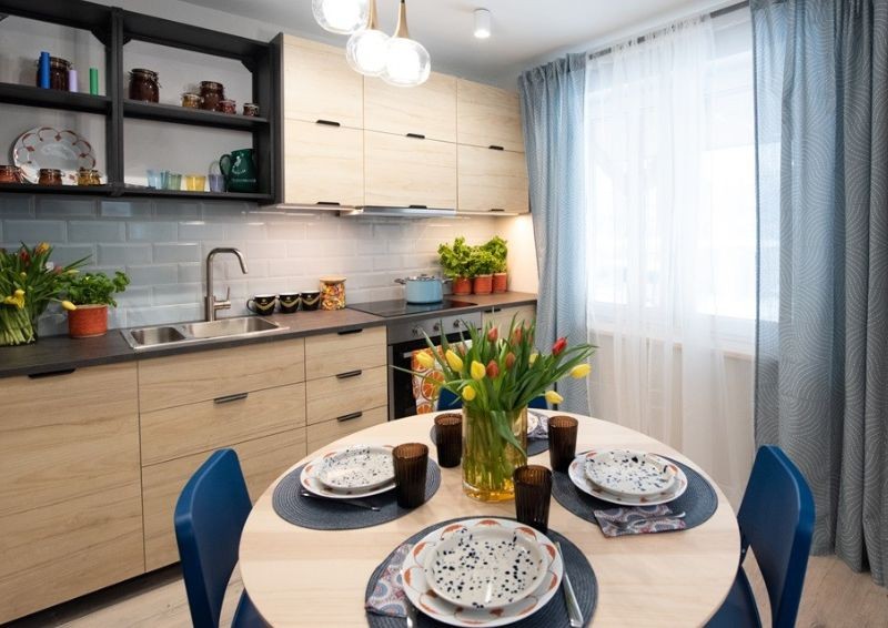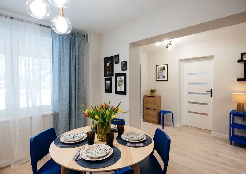 Kuchnia zaczęła pełnić również funkcję jadalną. Postawiono na jasne ściany, które w połączeniu z chabrowymi krzesłami i dodatkami, dodały życia nowej przestrzeni. Natomiast częścią wspólną stał się salon z wygodną sofą, utrzymaną w tym samym klimacie, co kuchnia.