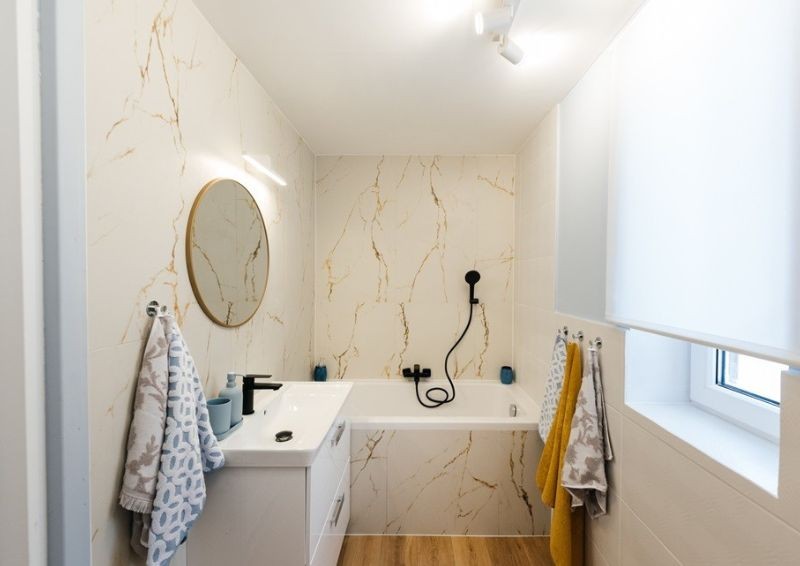 Dla rodziny najważniejsza była łazienka. Wcześniej była ona prowizoryczna, ale teraz należy do przeszłości. Maciej Pertkiewicz mocno ją wyróżnił decydując się na wykorzystanie motywu marmuru na płytkach.