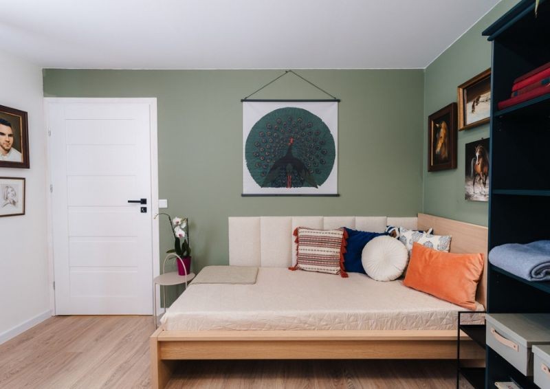 Stara część domu została zaadaptowana pod przestrzeń dla Pana Zbyszka. Dobrze oświetlony pokój, to idealne misce, w którym senior rodziny będzie mógł tworzyć swoje dzieła.