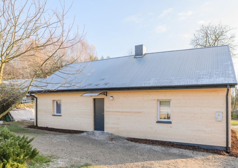 Z zewnątrz budynek został ocieplony, orynnowny oraz obłożony deską elewacyjną. Wymienione drzwi wejściowe prowadzą teraz do przedpokoju, w którym architekt zaplanowała meble na okrycia wierzchnie i buty.