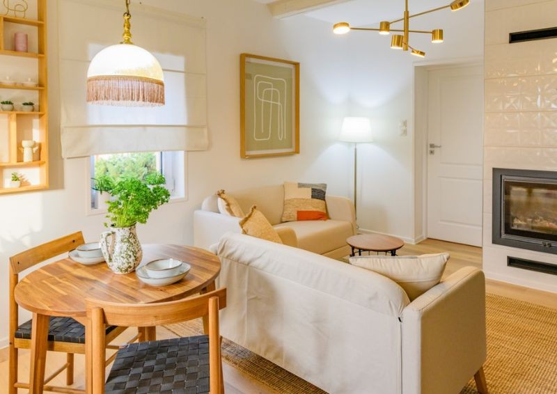 Największe pomieszczenie będzie pełniło dwie funkcje. W salonie stanął kominek, który rozprowadza ogrzewanie. Od teraz w domu będzie ciepło. Pokój dzienny dzięki nowym meblom i dodatkom jest funkcjonalny, elegancki i przytulny. Zaprojektowana w drugiej części pomieszczenia kuchnia, wyposażona została w nowoczesną zabudowę meblową oraz najnowocześniejsze sprzęty.