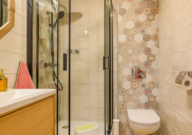 Łazienka to pomieszczenie, którego wcześniej nie było. Maciek ulokował ją teraz przy ścianie zewnętrznej budynku, po stronie drogi – ponieważ to właśnie tam Wiesław zaplanował nowe szambo i nie musiał wykonywać długiego przyłącza kanalizacyjnego.