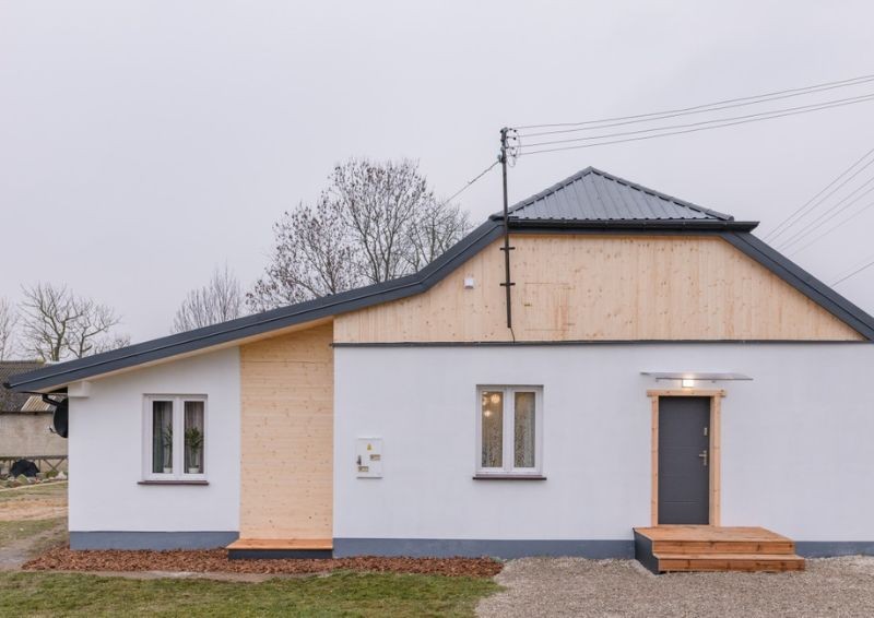 Ze starego dachu usunięto eternit i pokryto go nową blachą, dodano także orynnowanie. Starą elewację naprawiono, ocieplono i pomalowano na biało. Architekt zaplanował główne wejście do budynku w nowym miejscu. Dzięki temu udało się stworzyć wiatrołap i lepiej wykorzystać przestrzeń domu.