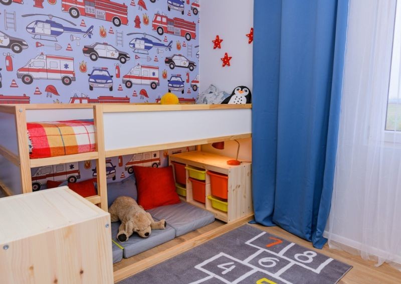 Pokój Franka wyszedł całkiem duży. Maciek był bardzo zadowolony z efektu końcowego. Chłopiec ma teraz swoje miejsce i sporą przestrzeń do nauki i zabawy. Na ścianie pojawiła się tapeta z motywami, które Franek bardzo lubi: strażą pożarną oraz policją.