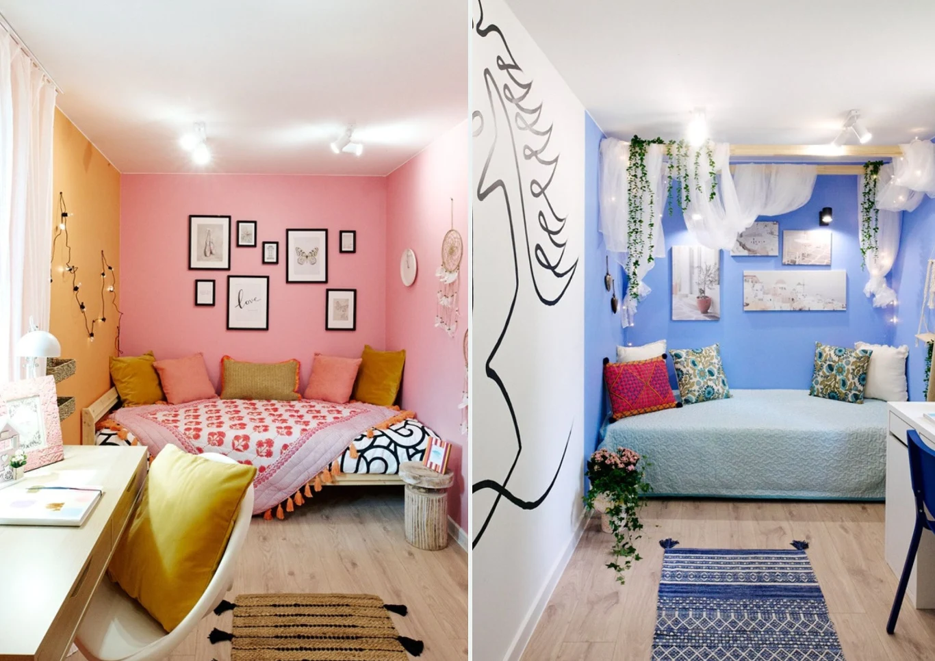 W pierwszej kolejności architekt Maciej Pertkiewicz skupił się na tym, by dopracować do perfekcji dwa pokoje, w których będą przebywać dziewczynki. Tym samym dla jednej z nich powstała przestrzeń zdominowana przez ściany pomalowane na różowo i pomarańczowo. Dużą rolę odgrywają jednak dodatki – mnóstwo ramek, lampek oraz łapaczy snów. Dodatkowo, w centralnym miejscu, umieszczono biurko wyposażone w akcesoria do malowania.