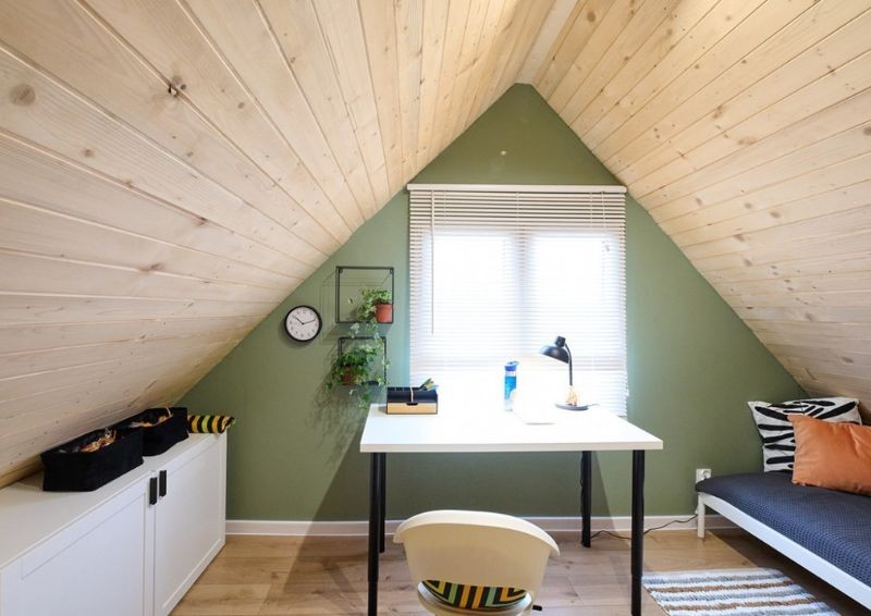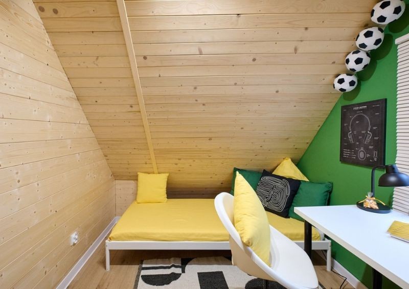 Natomiast miejsce na poddaszu stało się dwoma pokojami dla chłopców. W pierwszym z nich zaaranżowano dodatki nawiązujące do piłki nożnej oraz pomalowano ściany w odcieniu murawy. W drugim pomieszczeniu również postawiono na kolor zielony, ale w ciemniejszym wydaniu. Dodatkiem wyróżniającym stała się roślinność, która jeszcze bardziej ociepliła wnętrze.