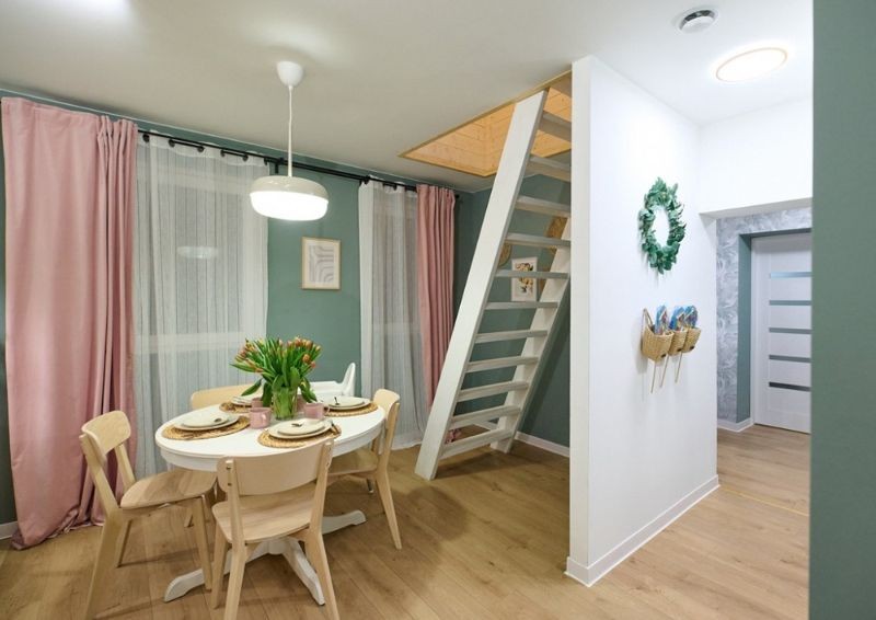 Projektant zagospodarował przestrzeń w taki sposób, że znalazło się w niej wiele pomieszczeń. Przede wszystkim kuchnia stała się pełnoprawnym miejscem do wspólnego spożywania posiłków. Przestała pełnić kilka dodatkowych ról. Maciej Pertkiewicz wybrał zieleń do zdominowania tej przytulnej przestrzeni.