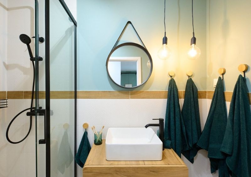 Przede wszystkim rodzina otrzymała łazienkę z prawdziwego zdarzenia. Stare pomieszczenie nie zachęcało do brania w nim kąpieli. Obecnie stało się małym, ale bardzo funkcjonalnym miejscem, w którym można poczuć się komfortowo. Tutaj również pojawiły się akcenty zieleni. Zamiast wanny, zainstalowano kabinę prysznicową.
