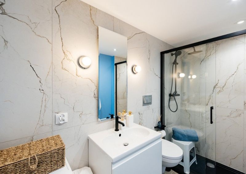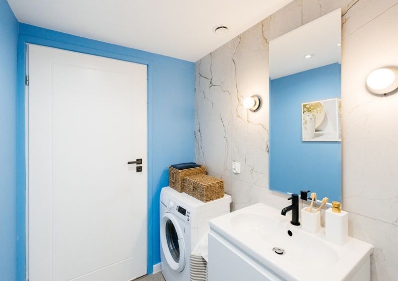 Wprowadzone zmiany miały też duże znaczenie estetyczne. Po odpadającej podłodze nie pozostał ślad, zastąpiły ją wypoziomowane płytki o przyjemnym kolorze i strukturze. Dodatkowo duże, białe płytki gresowe z efektem dekoracyjnego spękania położone na ścianach pozwoliły rozjaśnić część prysznicową, a zestawienie ich z czarną armaturą, białymi dodatkami i wysyconymi błękitnymi ścianami dało nowoczesny efekt.