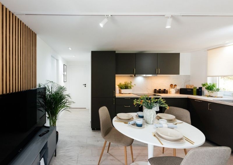 Zamontowano prostą, funkcjonalną zabudowę kuchenną, wykorzystując część otwartego na nowo wnętrza. W pokoju znalazła się strefa jadalniana oraz wypoczynkowa. Kolorystycznie zdominowała ją biel, rozmaite odcienie szarości i beże. Barwnym akcentem przełamującym ten kierunek jest rozkładany narożnik w ciemniejszym odcieniu mięty oraz modne płyty lamelowe za telewizorem.