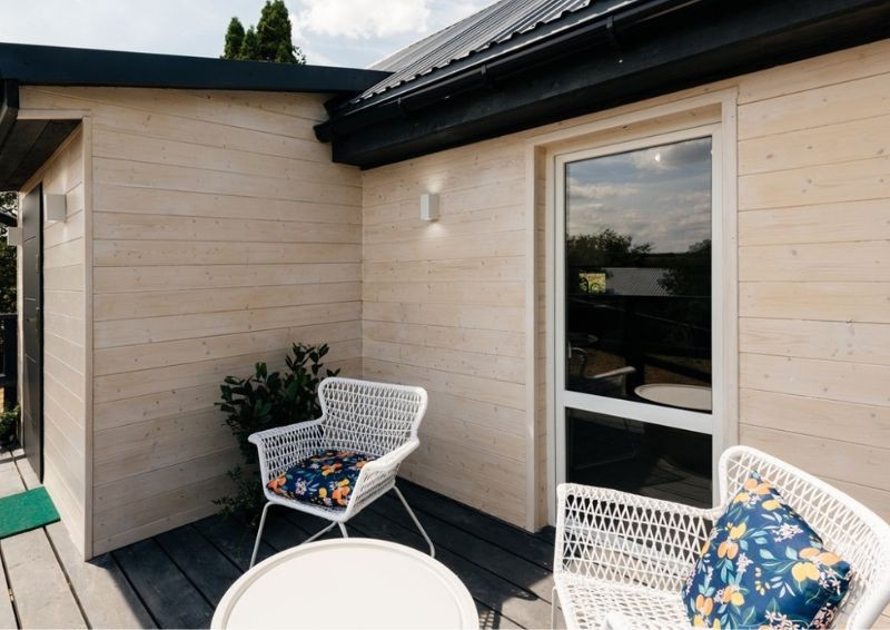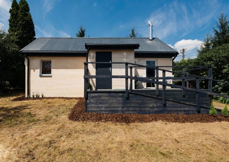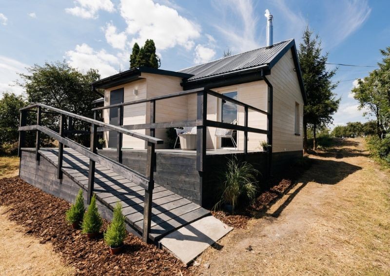 Do drzwi doprowadzono wygodne podejście w formie rampy, a wokół ganku dobudowano słoneczny, otwarty taras z ochronną barierką. Mimo że remont ten bardziej przypominał postawienie budynku na nowo, a z pewnością jego pełne przeprojektowanie, oczyszczenie i modernizację, ekipa znalazła jeszcze czas na uporządkowanie zieleni w ogrodzie.