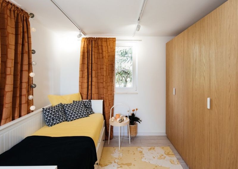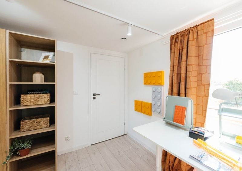 Pokój rozjaśniły również umiejętnie dobrane barwy: jasne kolory ścian, białe meble, słoneczne dodatki, szafa w odcieniu ciepłego, naturalnego drewna oraz miękkie panele dekoracyjne na ścianie.