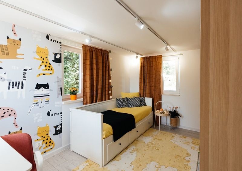 Podłogę wykończono trwałymi panelami z efektem bielenia, na które trafił oryginalny, nakrapiany dywan. Fragment ściany przy biurku ozdobiła tapeta z dekoracyjną grafiką, której głównym motywem były wielobarwne koty. Otwarta, dobrze zorganizowana przestrzeń oraz jasne dodatki sprawiły, że wnętrze stało się przyjazne dla dziecka i jednocześnie bardzo przytulne.