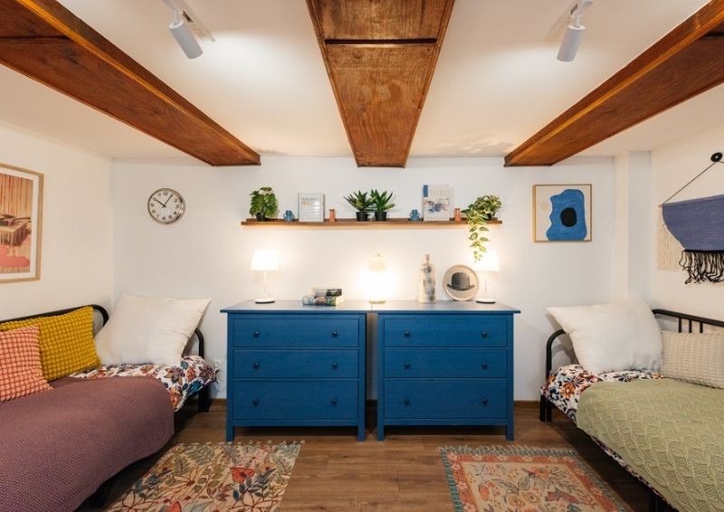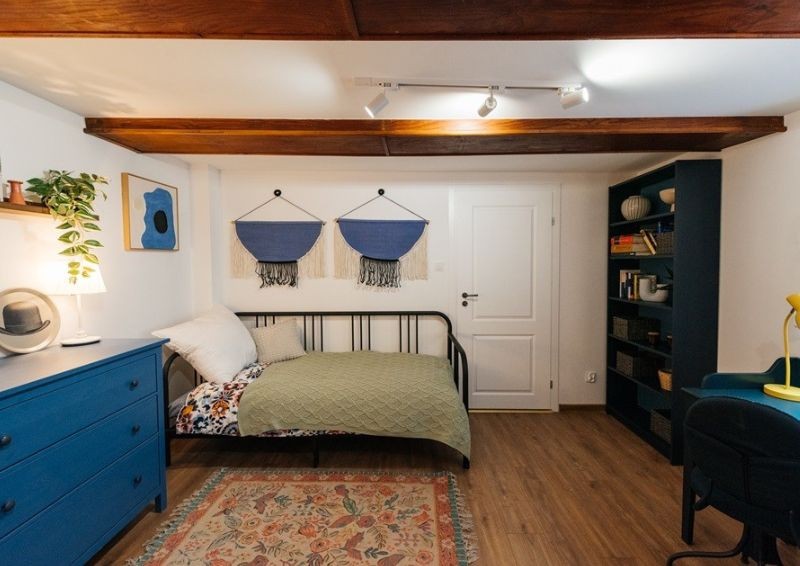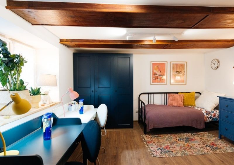 Ostatnie pomieszczenie w domu będzie należeć do nastolatek. Kinga i Julia zyskały własne królestwo, w którym nie brakuje pojemnych szafek i biurek w różnych odcieniach niebieskiego. Martyna i w tym pokoju wybrała białą farbę na ściany, by zestawić je z kolorowymi meblami.