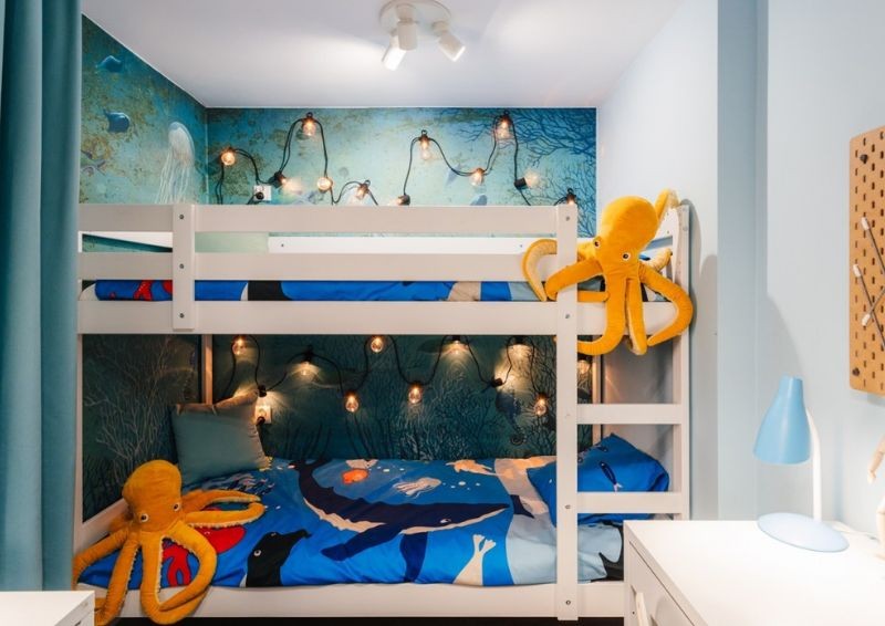 Dla chłopców przewidziano jeden, ale bardzo duży pokój z przestronnym łóżkiem piętrowym i dwoma biurkami. Marta przemyciła do pokoju elementy nawiązujące do pasji wędkarskiej dorastających chłopaków.