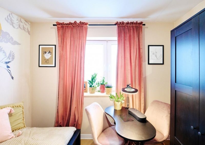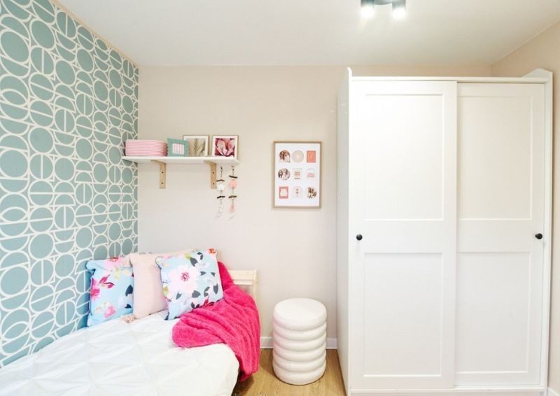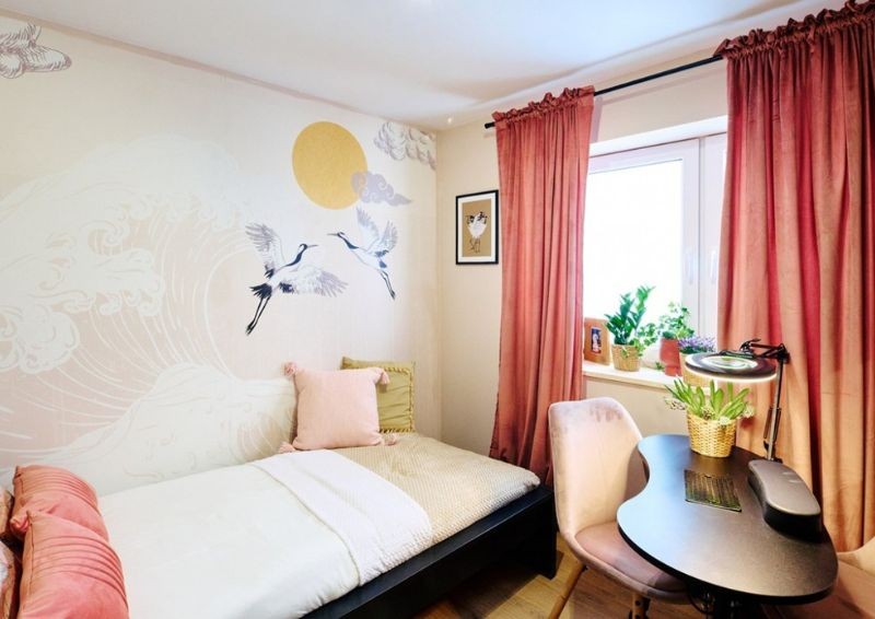 W miejscu, w którym znajdowała się kuchnia, ulokowano przytulny pokój dla pani Ani. Na ścianiach pojawiła się brzoskwiniowa farba i ozdobna tapeta. Dodatkowo wstawiono dużą szafę oraz stolik dla gości.