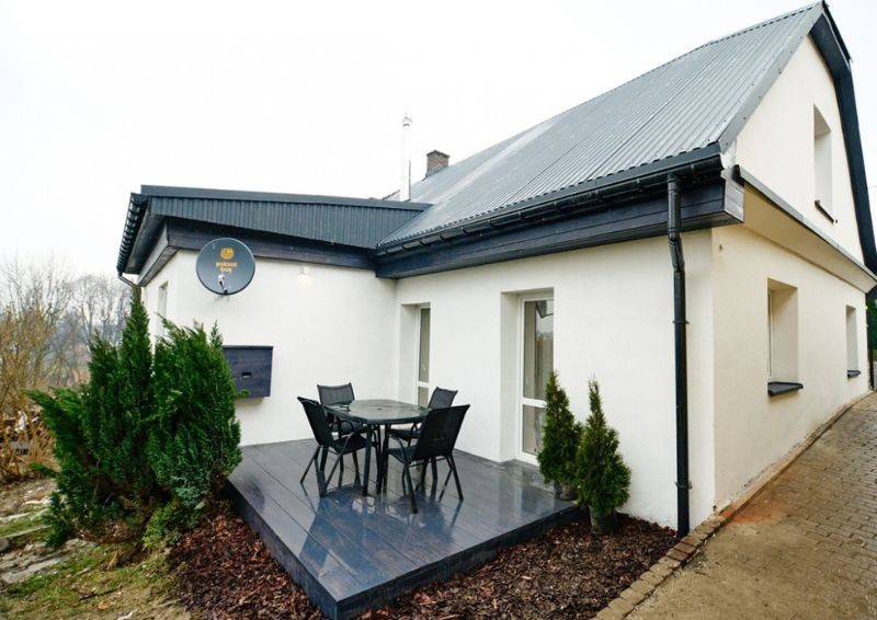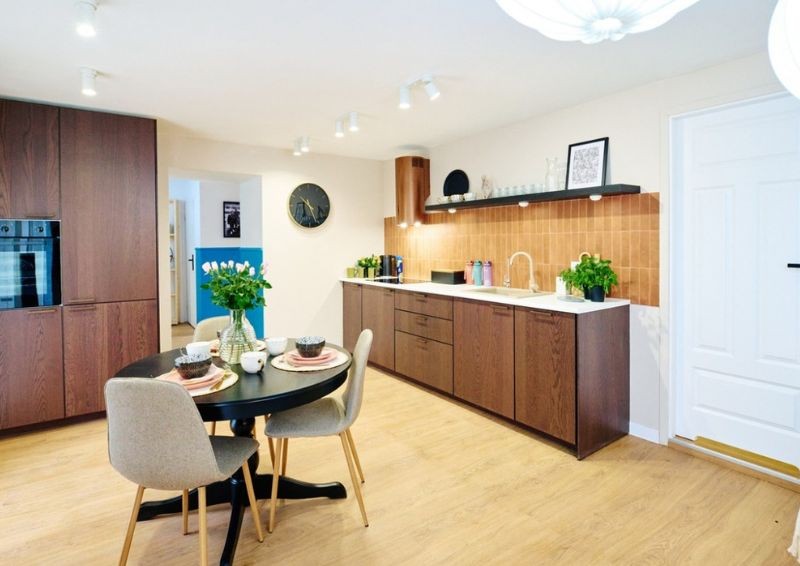Najważniejszym miejscem w odnowionym domu stał się salon z kuchnią i jadalnią. Wcześniej była to tylko pusta przestrzeń w surowym stanie, a zespół Przemka Oślaka tchnął w to pomieszczenie życie. Całość pomalowano na beżowo oraz skontrastowano z ciemnymi meblami. Jedynie wyjątek stanowi narożnik w jasnym odcieniu niebieskiego.