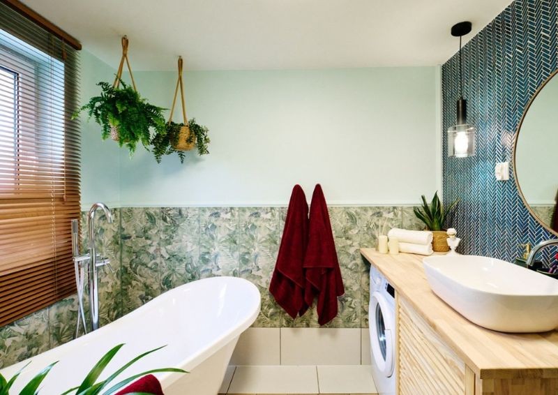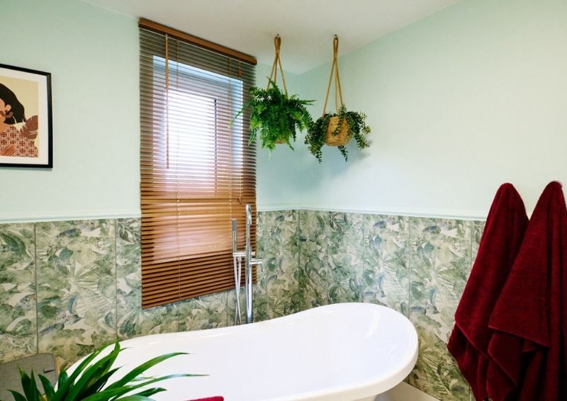 Całkiem nowe oblicze zyskała łazienka - zniknęło stare wyposażenie, a zamiast tego Marta Kołdej wymyśliła całkiem inny rozkład. Postawiła na seledynowy odcień ścian oraz na dekoracyjne, kolorowe płytki. W centralnym miejscu stanęła duża wanna i nie zabrakło także akcentów zielonych w postaci roślin doniczkowych.