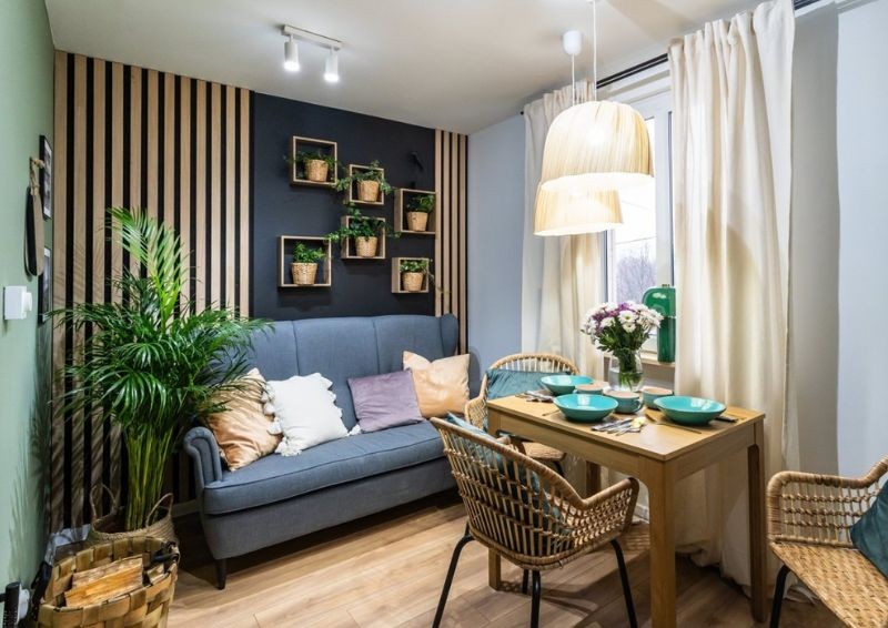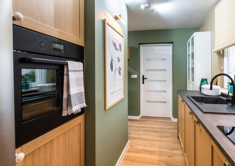 W kuchni panował chaos. Przez brak wystarczającego miejsca, znajdowało się w niej wszystko – a największą przestrzeń zajmowała sofa, pełniąca rolę krzeseł przy stole jadalnianym. Misz masz sprawiał, że gotowanie wymagało dobrej organizacji. Maciej postanowił mocno zmodyfikować układ pomieszczenia – oddzielił kuchnię od jadali i w drugiej części, poza stołem i krzesłami, dodatkowo umieścił sofę, czyniąc to miejsce także wypoczynkowym. Kuchnię pomalowano w odcieniu zielonym, a w salonie połączono zieleń z granatem. Dodatkowo za sofą umieszczono jasne lamele, które dodały elegancji w nowym salonie.
