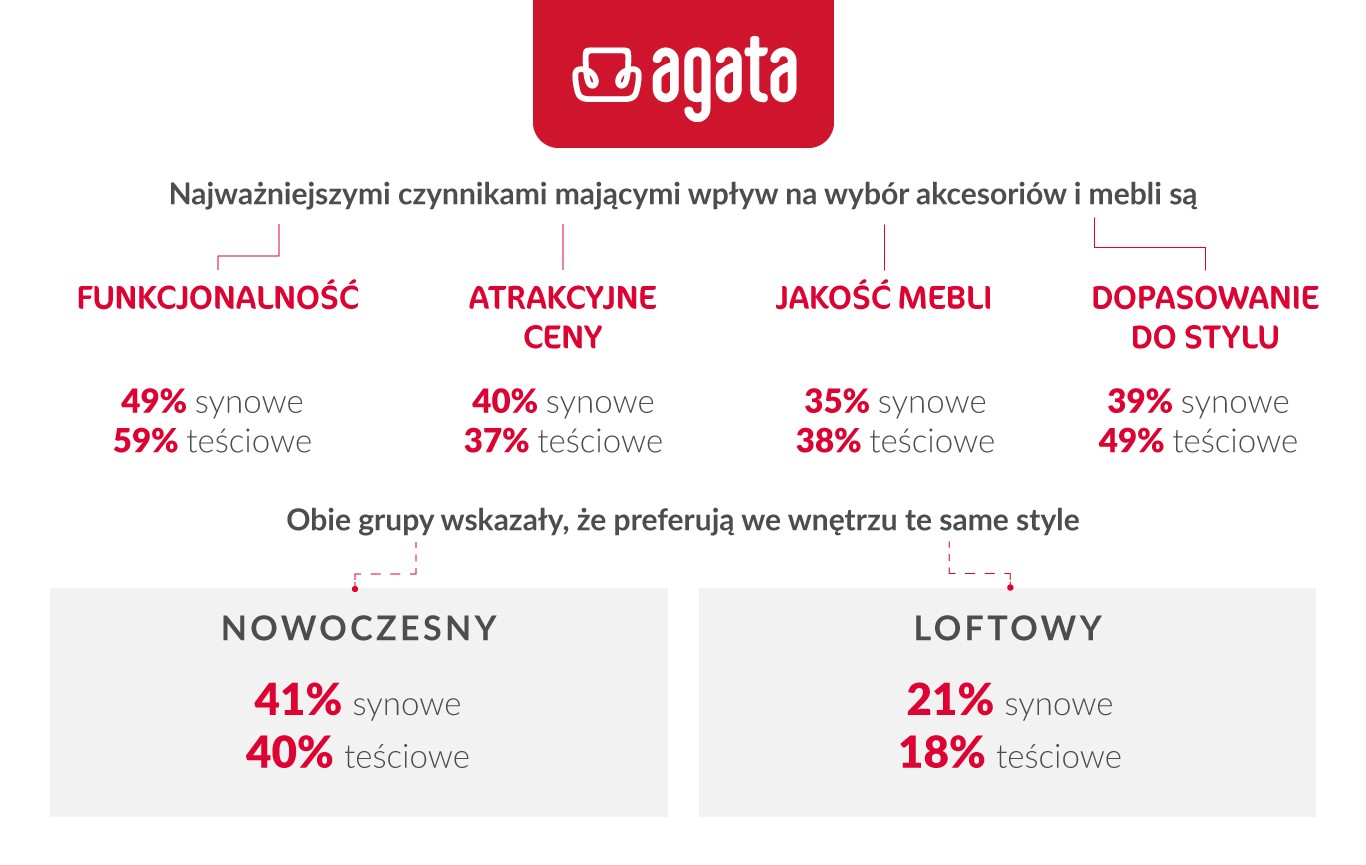 Okazuje się również, że teściowe i synowe w kwestii wyboru akcesoriów i mebli stosują bardzo podobne kryteria. Dla obu grup najważniejszymi czynnikami mającymi wpływ na wybór akcesoriów i mebli są funkcjonalność (49% synowe, 59% teściowe), atrakcyjne ceny (40% synowych i 37% teściowych), jakość wykonanych mebli (35% synowych i 38% teściowych) i dopasowanie do stylu (39% synowe, 49% teściowe). Takie postrzeganie może przyczynić się do dobrej współpracy podczas wspólnych zakupów czy urządzania wnętrz. Jak widać, cenią sobie nie tylko oszczędność finansową, ale przede wszystkim funkcjonalność, jakość i markę, co świadczy o świadomości konsumenckiej obu grup.