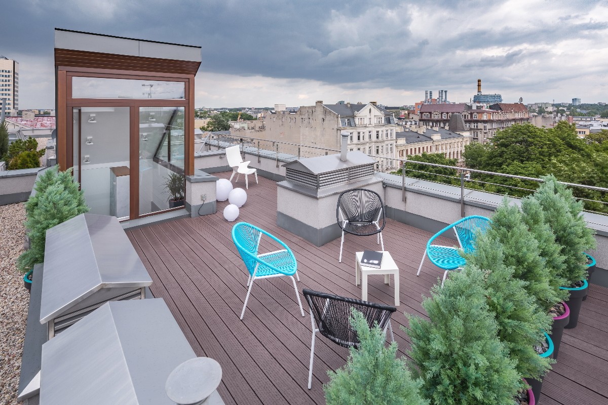 Montaż bez wkrętów to zauważalna przewaga kompozytu. Na tarasach kompozytowych, w przeciwieństwie do drewnianych, nie uświadczymy widocznych elementów montażowych. Służą do tego dedykowane systemy niewidocznego montażu, oparte na klipsach z tworzywa lub stali nierdzewnej. W połączeniu z aluminiowymi legarami otrzymujemy taras, który doskonale radzi sobie ze zmiennymi warunkami atmosferycznymi. Oczywiście kompozyt nie jest materiałem niezniszczalnym. Przesuwanie ciężkich przedmiotów (o ostrych krawędziach) może odcisnąć piętno na powierzchni. Szkodzi mu też tłuszcz (najbardziej rozgrzany), wylane wino lub kawa. Dlatego do usuwania mocniejszych zabrudzeń warto wyposażyć się w specjalny środek pielęgnujący (np. Owatrol Compo Clean). Jednak nie licząc ekstremalnych przypadków — bieżąca pielęgnacja tarasu kompozytowego ogranicza się do zamiatania piasku oraz mycia (wystarczy wodą z płynem do naczyń). Przez resztę czasu rozkładamy leżaki, zapraszamy bliskich i wspólnie cieszymy się z udanej inwestycji. Kompozyt oraz systemowe legary aluminiowe to taras na każdą pogodę.