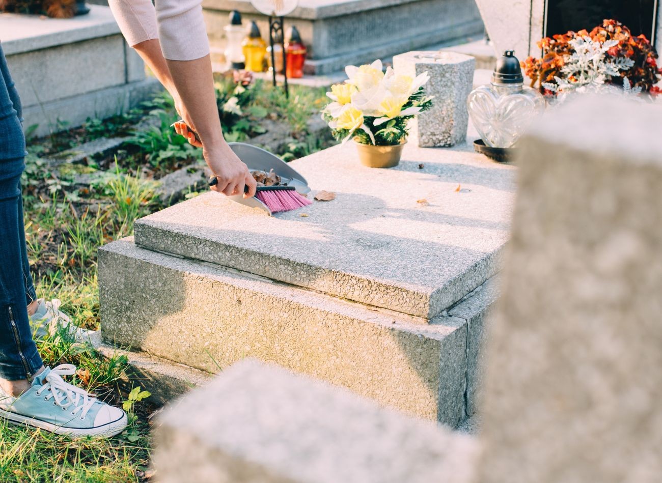 Sprzątanie każdego grobu powinniśmy zacząć od dokładnego pozamiatania płyty nagrobnej z liści, kurzu i pyłu. Fot. Daniel Jedzura/1234RF.com