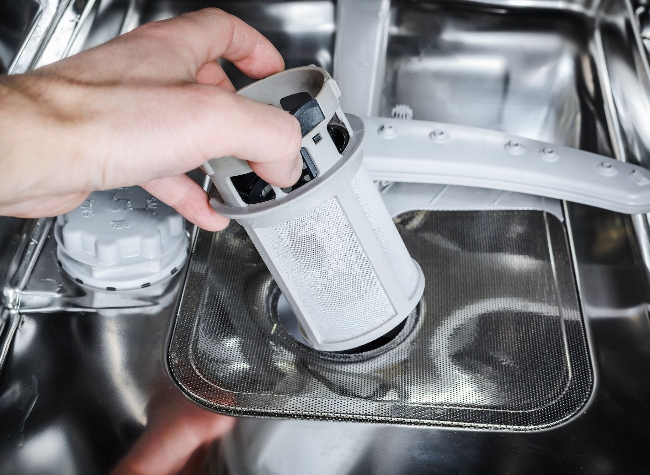 Podstawą prawidłowej pielęgnacji zmywarki i zapobiegania brzydkim zapachom jest regularne czyszczenie filtra, uszczelek i dysz, w których gromadzą się resztki jedzenia. Fot. aliaksandrbarysenka/CanvaPro