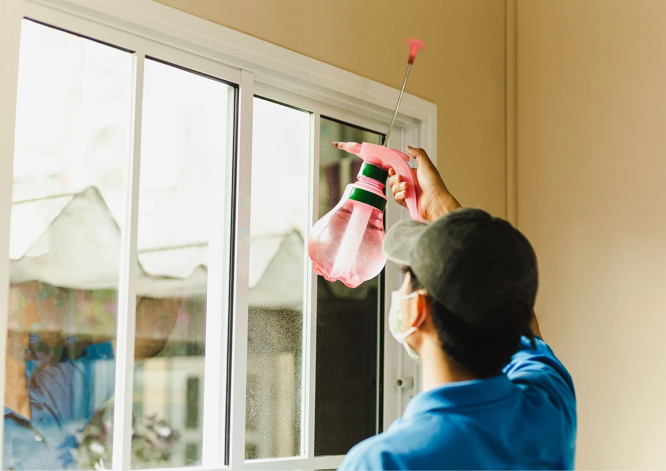 Kiedy folia dokładnie przylega do szyby, nadmiar odetnij za pomocą ostrego nożyka budowlanego wzdłuż listwy okna. Dopasowaną folię zdejmij z szyby. Ostrożnie pozbądź się warstwy ochronnej z folii, nawilż klej płynem za pomocą rozpylacza. Ponownie przyłóż folię, tym razem klejem do szyby. Za pomocą ściągaczki pozbądź się nadmiaru płynu i powietrza. Szczególną uwagę zwróć na krawędzie.