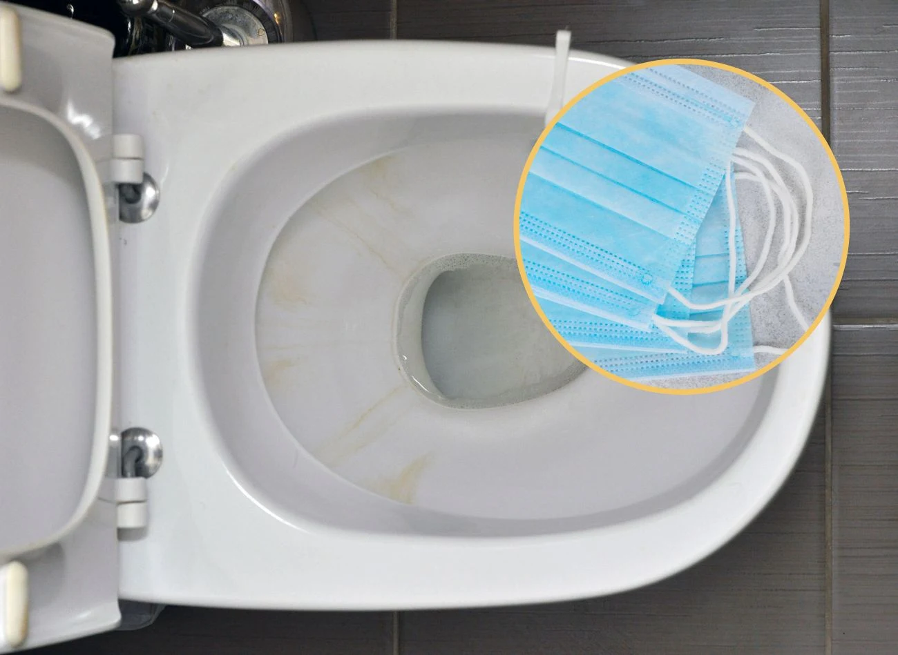 Aby wyczyścić żółte zacieki z muszli klozetowej, weź maseczkę chirurgiczną i odetnij jej koniec. Do środka maseczki włóż 2 wcześniej przygotowane kulki i zwiąż gumką. Na koniec maseczkę z kulkami wystarczy wrzucić do spłuczki. Dzięki temu po żółtych zaciekach nie powinno być śladu. Co więcej, w toalecie będzie unosił się przyjemny zapach.
