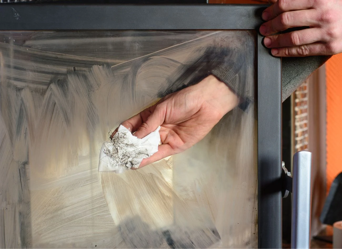 W kominkach, w których takich ruch jest możliwy, warto zdjąć szybę i wyczyścić ją na płasko. W konstrukcjach bardziej złożonych, w tym narożnych, gdzie wymontowanie szkła jest problematyczne, jego zabrudzoną stronę wyczyść tradycyjnie, otwierając drzwiczki na oścież i rozkładając pod nimi stary ręcznik, folię lub gazety.