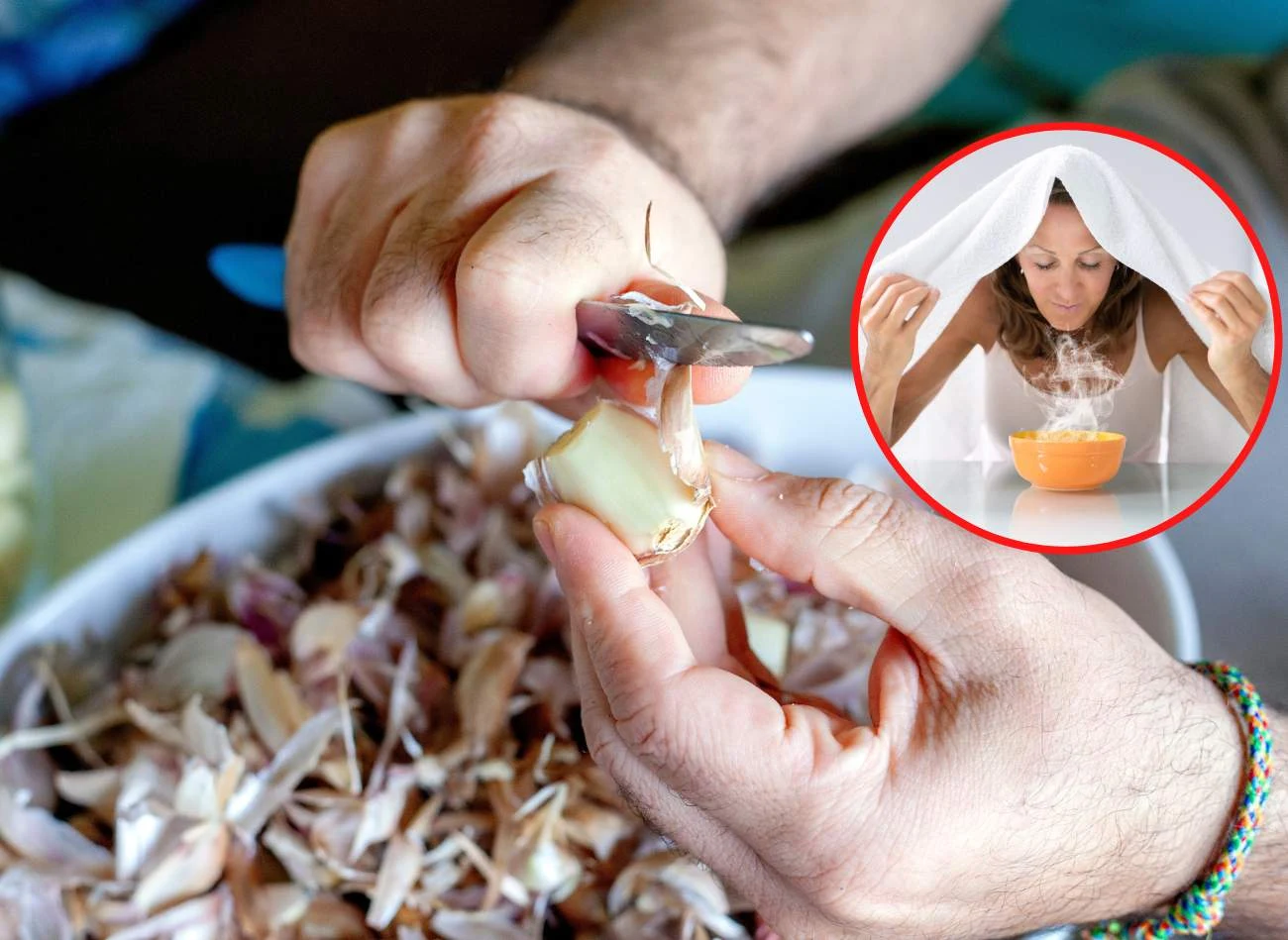 Inhalacje z łupin czosnku mogą przynieść ci ulgę przy zatkanym nosie. Aby wykonać domową kurację, musisz jedynie wysypać na rozgrzaną patelnię obierki i wdychać powstające opary przez około 5 minut. Taka inhalacja zadziała odkażająco na układ oddechowy i pomoże złagodzić kaszel. Zabieg warto powtarzać codziennie, jednak nie dłużej, niż przez tydzień.