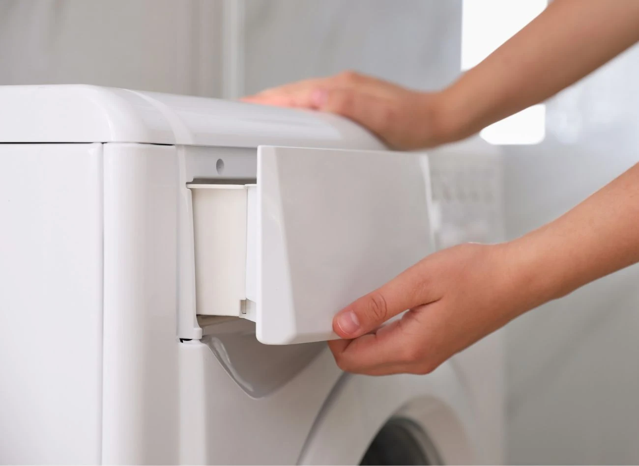 Aby dokładnie wyczyścić dozownik, w pierwszej kolejności wyjmij go z pralki. Zazwyczaj jest to dość intuicyjna czynność – większość modeli ma małą blokadę/przycisk na środku lub z tyłu szufladki. Jeżeli jednak masz z tym problem, sprawdź w instrukcji obsługi. Najbardziej skuteczna metoda czyszczenia szufladki składa się z dwóch etapów: