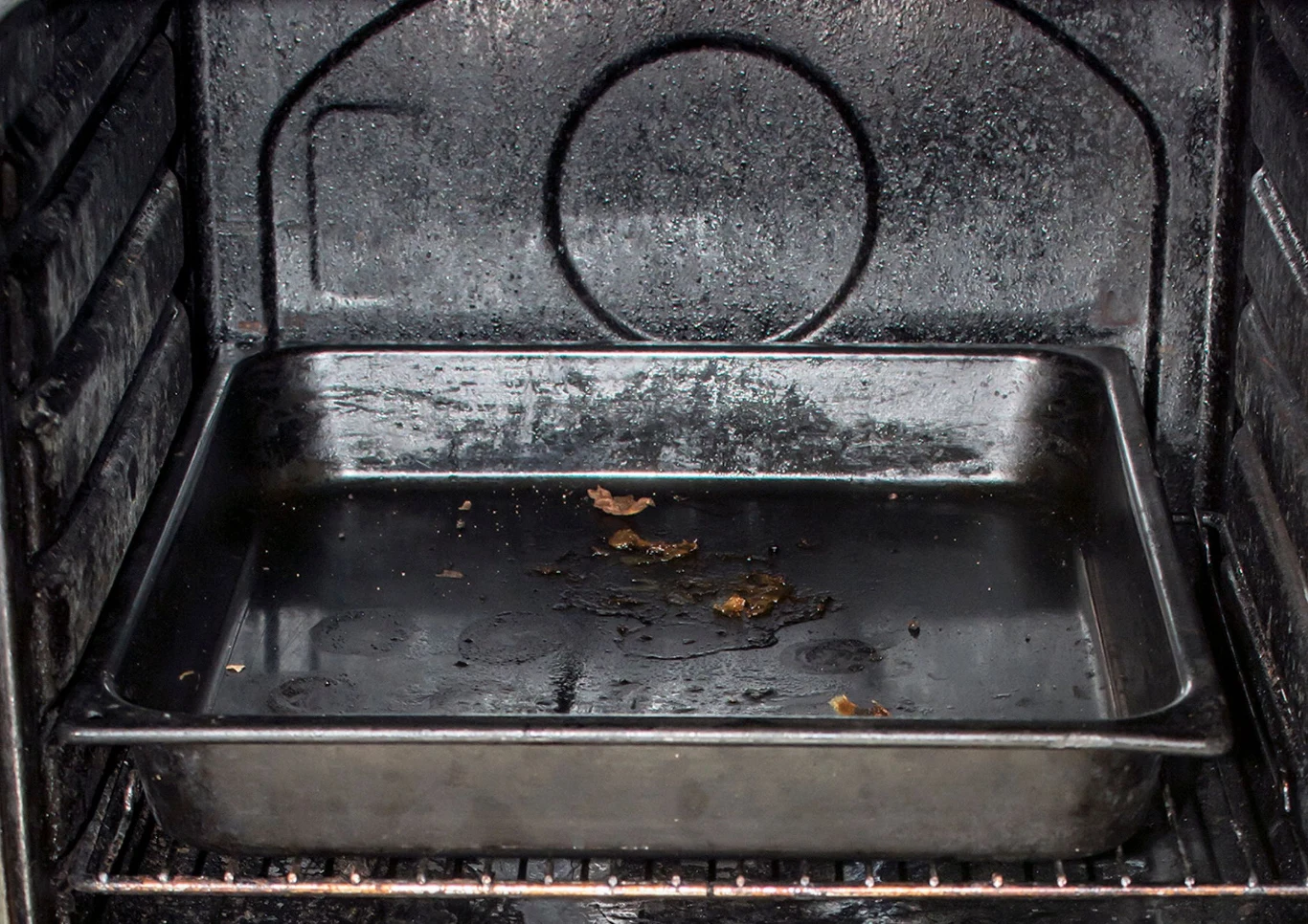 - Wyjmij brudną blachę z piekarnika i zalej ją ciepłą wodą.