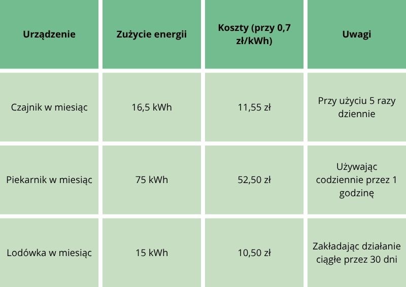 Jak te wyniki wypadają na tle innych urządzeń? W poniższej tabeli zestawiłam porównanie zużycia energii przez czajnik elektryczny, piekarnik i lodówkę: