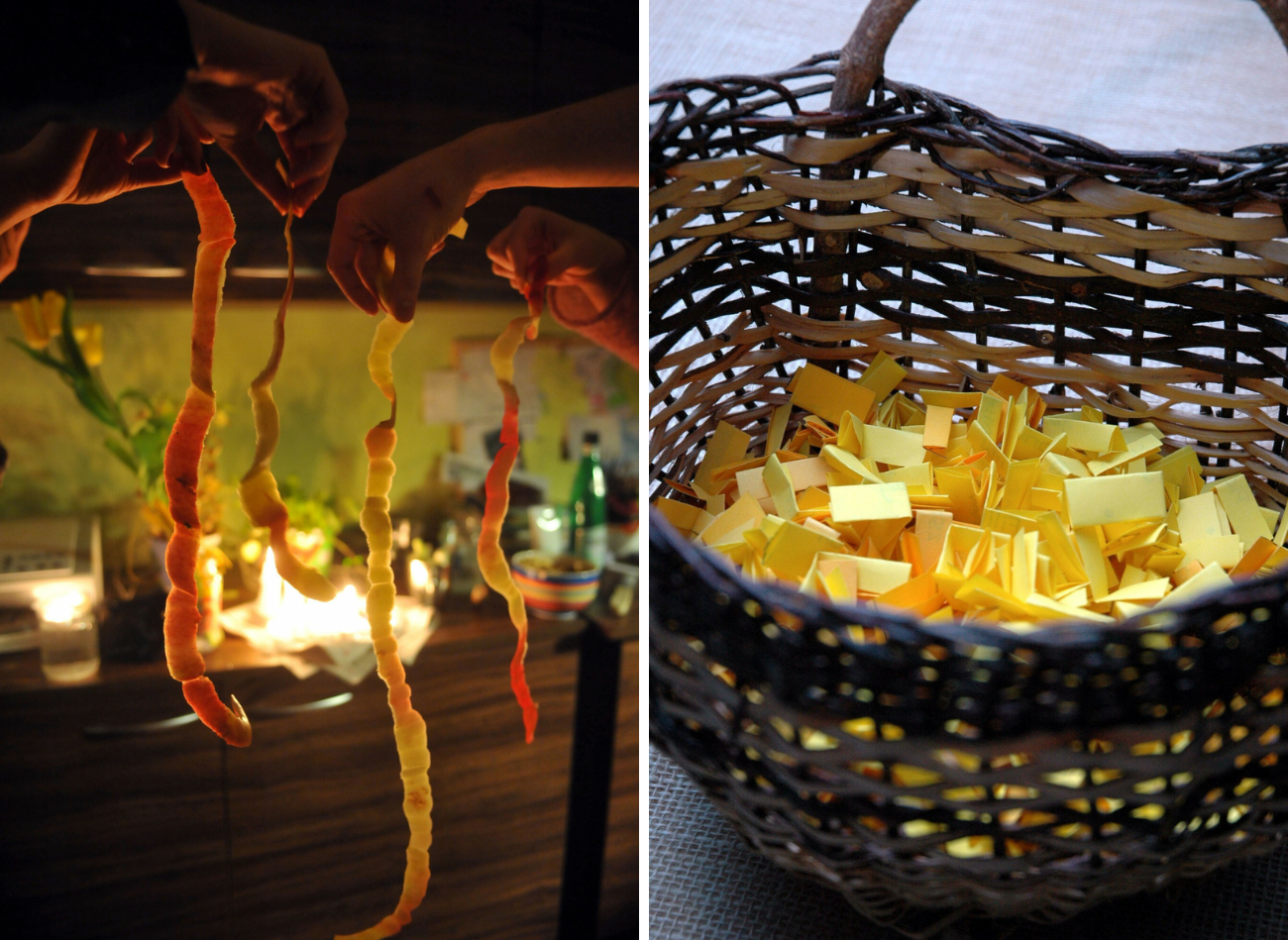 Potrzebujesz skórki z jabłek i nożyka. Obieramy jabłuszka. Ciskamy za siebie obierki, a z ich zakrętów próbujemy zgadnąć literę początkową imienia przyszłego narzeczonego.