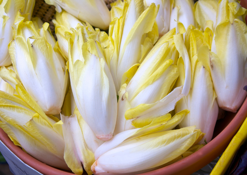 Pędzona cykoria ma delikatniejszy smak niż ta uprawiana w gruncie. Jej kremowobiałe, chrupiące liście mogą być wykorzystane w zimowej kuchni na wiele sposobów.
