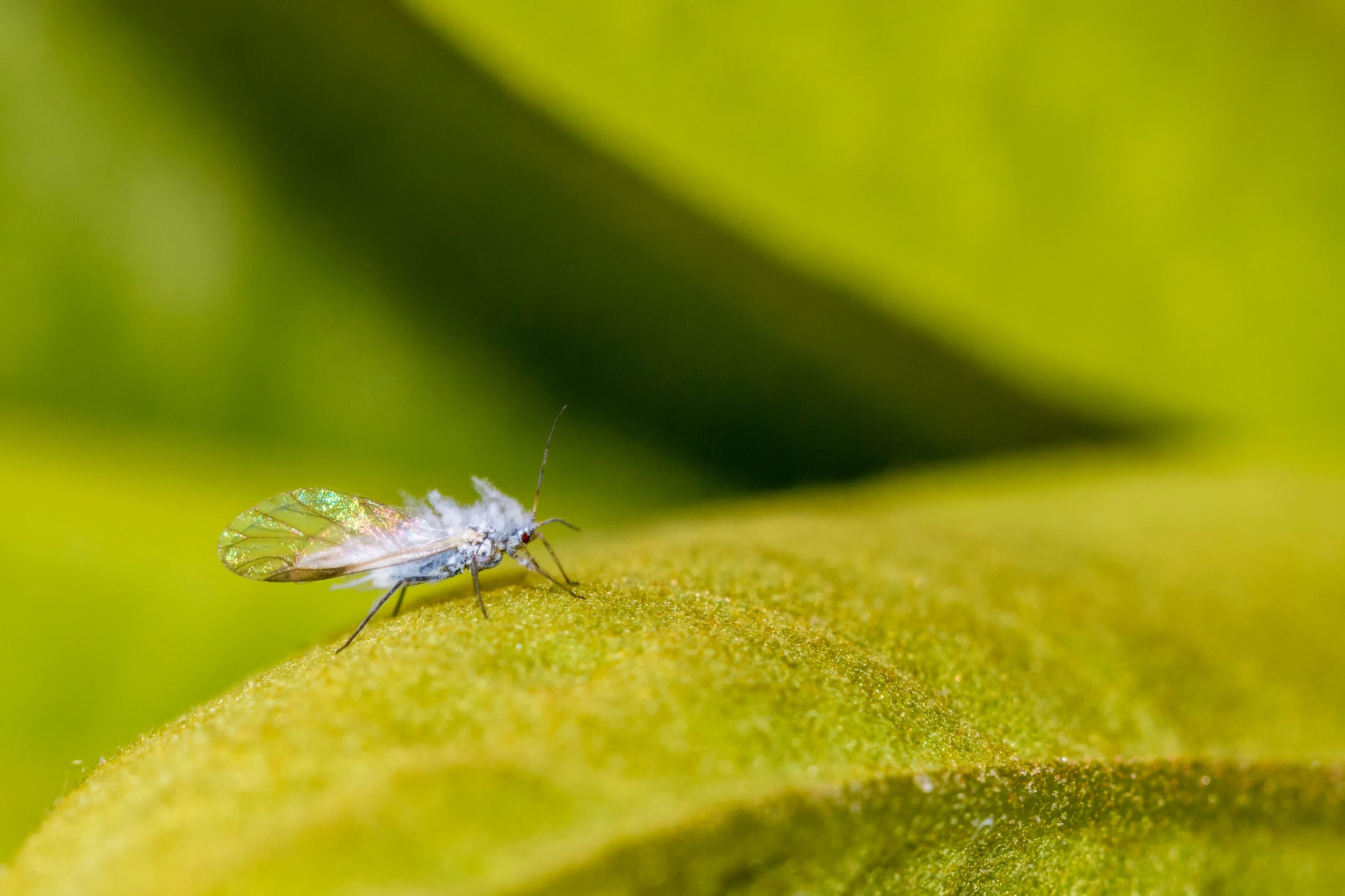 - pozbawionej skrzydeł: szkodniki mają brunatny kolor i są pokryte charakterystycznym białym nalotem.