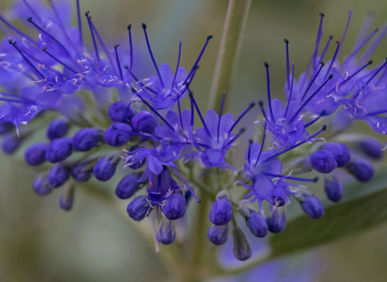Największą ozdobą barbuli są intensywnie niebieskofioletowe kwiaty, które pojawiają się od sierpnia do października w niewielkich, puszystych kwiatostanach w kątach liści. Ich głęboka barwa przyciąga pszczoły i motyle.