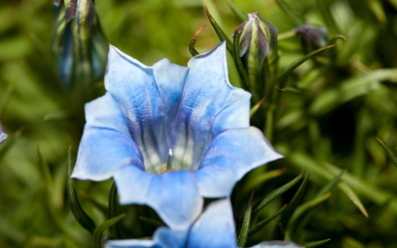 Na pierwszy rzut oka roślina może wydawać się niepozorna, lecz od września zmienia wygląd diametralnie, pokrywając się okazałymi, pojedynczymi kwiatami w intensywnym odcieniu błękitu. Każdy z nich osiąga około 5–6 cm długości i ma trąbkowaty kształt z wyraźnie widocznymi białozielonymi prążkami w dolnej części płatków. Odmiany ogrodowe, takie jak ‘Alba’ czy ‘Plena’, oferują dodatkowo inne warianty kolorystyczne – czystą biel i pełne, wielopłatkowe kwiaty w szafirowych tonacjach. W sprzyjających warunkach roślina kwitnie aż do pierwszych przymrozków, co czyni ją jedną z ostatnich barwnych bylin sezonu i cennym źródłem pyłku dla owadów aktywnych jesienią.