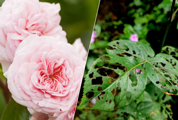 Typowymi objawami żerowania szkodników są wygryzione dziury w liściach róży. Fot.123RF.com