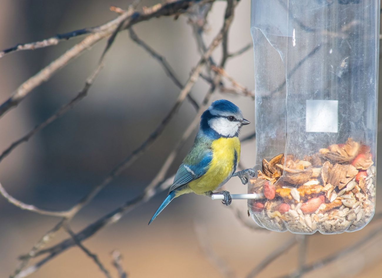 Zawieś w ogrodzie karmniki, np. zrobionej z butelki po wodzie mineralne, i napełnij je odpowiednim dla ptaków jedzeniem. Fot. hiperdino/123RF.com