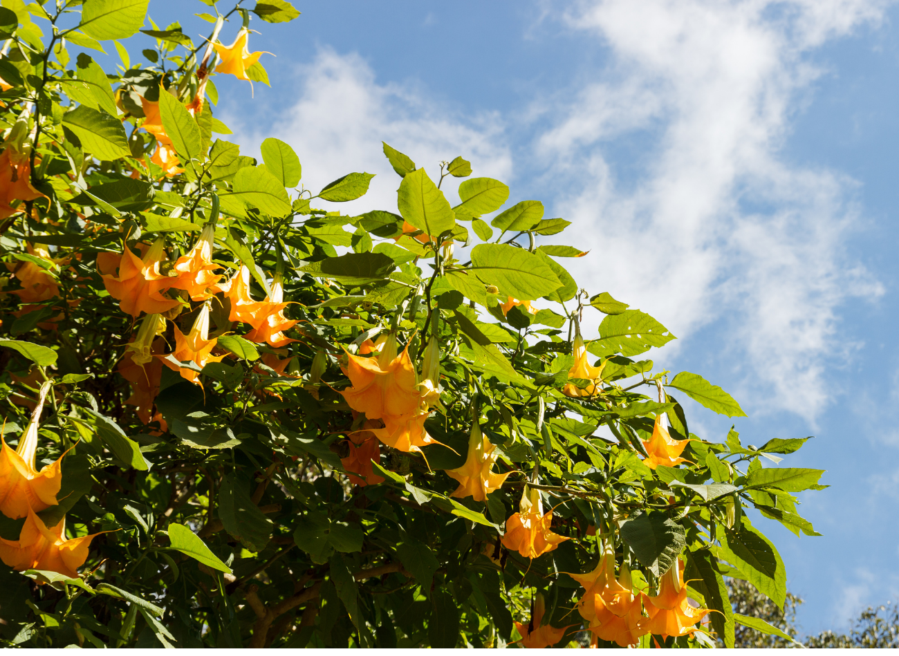 Okazałe, lejkowate kwiaty mają kształt trąbek i nazywane są “anielskimi trąbami”. U datur wieloletnich są skierowane w dół i do tego naprawdę duże – mogą osiągać nawet 40 cm długości! Przybierają najróżniejsze kolory, m.in. żółty, pomarańczowy, koralowy, różowy lub biały, czasem ozdabiają je też obrzeża i jasne smugi. Mogą być pojedyncze, pełne lub półpełne. Pojawiają się obficie wiosną i zdobią roślinę przez całe lato, aż do późnej jesieni. Wydzielają intensywną i wręcz odurzającą woń. Co ciekawe, jednoroczne datury mają kwiaty mniejsze (do 20 cm), skierowane ku górze i mogą kwitnąć nawet kilkakrotnie w ciągu jednego sezonu.