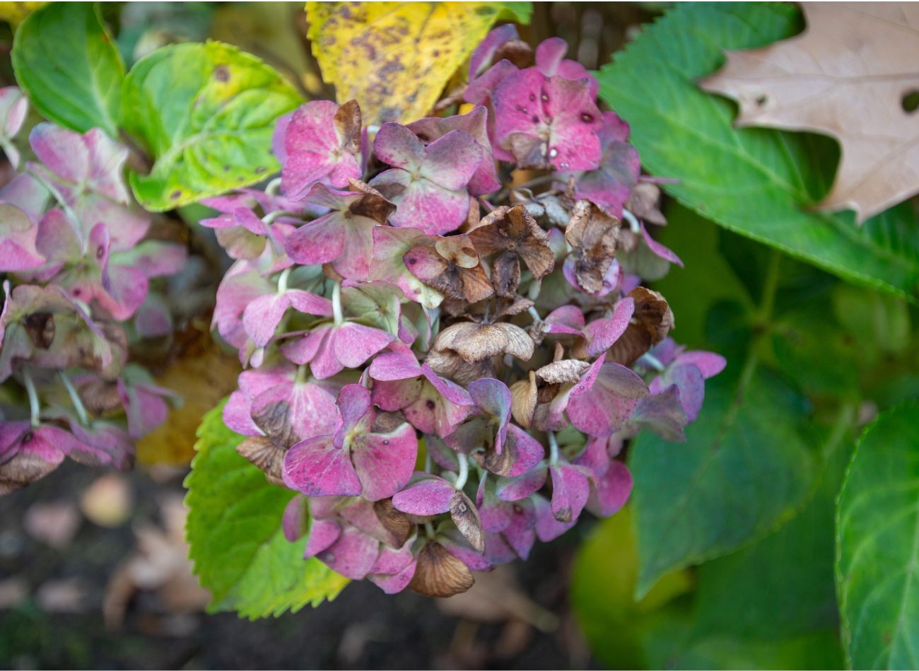 Gdy hortensja choruje lub ma nieodpowiednie warunki daje znać nie tylko przez żółknięcie lisci. Fot. emsonCanvaPro