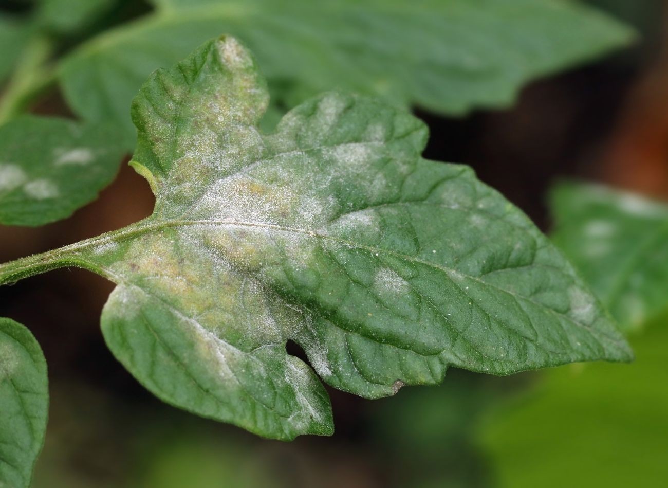 Białe lub szarawe plamy na liściach pomidorów i ogórków to mączniak. Fot. Elena Klevtsova/123RF.com